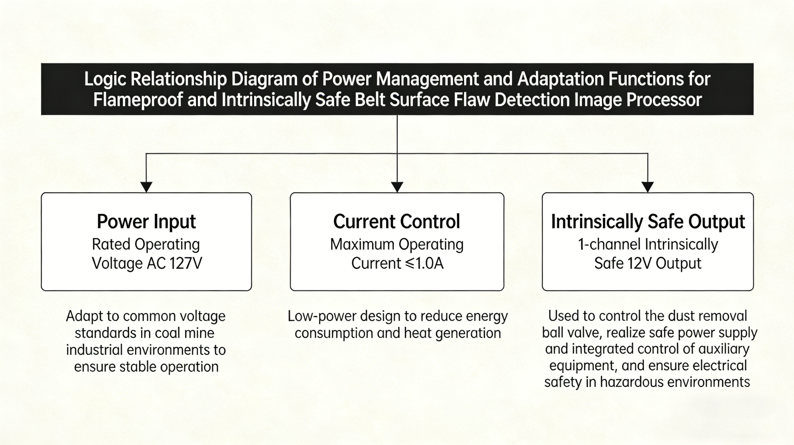 This image processor has stable management capabilities for power input and output. Its rated operating voltage is AC 127V, which can adapt to the common voltage standards used in specific industrial environments such as coal mines, ensuring the equipment operates stably under standard power supply conditions. The maximum operating current is ≤ 1.0A, demonstrating its low power consumption feature, which can effectively reduce energy consumption and minimize heat generation. At the same time, the device provides 1 safety 12V output, specifically for controlling the dust removal ball valve, achieving safe power supply and integrated control for auxiliary equipment, ensuring electrical safety in hazardous environments.