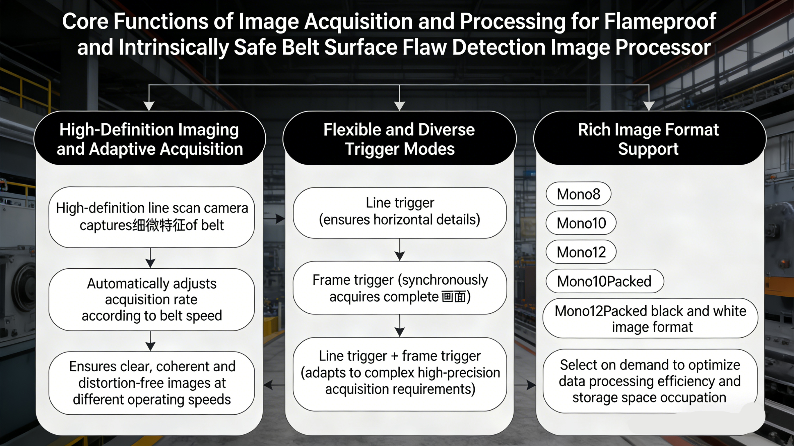 Equipped with a high-definition line-scanning camera as the core component for image acquisition, it can capture the fine features of the belt surface. The key lies in its ability to automatically adjust the rate according to the belt speed for image capture. This feature ensures that regardless of the belt's operating speed, clear, continuous, and distortion-free image data can be obtained, providing high-quality raw materials for subsequent flaw detection analysis.